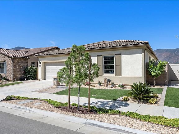 Welcome to this stunning three-bedroom, two-bath home offering an expansive open floor plan with panoramic mountain views. The chef’s kitchen boasts upgraded “moon white” granite countertops, ceiling-height stacked cabinets, pull outs in the lower cabinets, a farmhouse porcelain sink, walk-in pantry, and ample storage, complemented by Kitchen Aid stainless steel appliances. A see-through wet bar features a dual-temperature zone refrigerator, sink, and RO System. Relax by the lovely gas fireplace surrounded by built-in glass shelves. The primary suite retreat showcases new tile flooring, a custom California Closet System, upgraded quartz countertops with new fixtures, dual sinks, dual-flush toilets, and a walk-in shower with custom glass etching. Additional flexible living space adds versatility to suit your lifestyle. This home features a neutral color palette, beautiful engineered wood flooring, and recessed lighting throughout. Enjoy breathtaking views from the California room with a motorized screen and retractable awning. The low-maintenance yards include artificial grass, stone, and concrete pathways. The two-car garage is equipped with 2- 220V 50 amp outlets for electric cars, a new LiftMaster Wallmount garage door opener and springs, and epoxy flooring with abundant storage space. A fully owned solar electric system with 18 panels (5.67Kw system), galvanized steel bird screens, and 2 Tesla Powerwall 2 units provide sustainable energy solutions. For golfing enthusiasts, indulge in a remote-controlled golf simulator setup featuring three screens, a projector, and netting installed in the garage, and putting green out back. Located in the gated 55+ community of Terramor, residents enjoy resort-style amenities including 2 clubhouses, three swimming pools, (one indoor) spa, sauna, full gym, outdoor cooking areas, event rooms, a full bar, barbecue areas, picnic spots, pickleball and tennis clubs, dog parks and sports park. Come and join one of the clubs. Close to the 15 freeway.