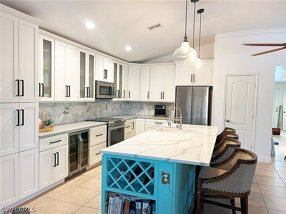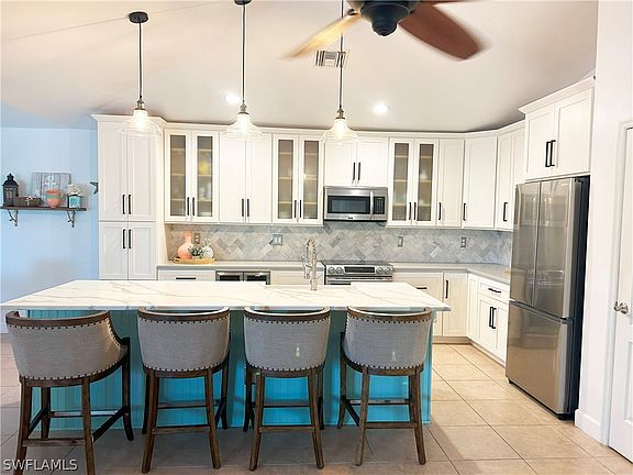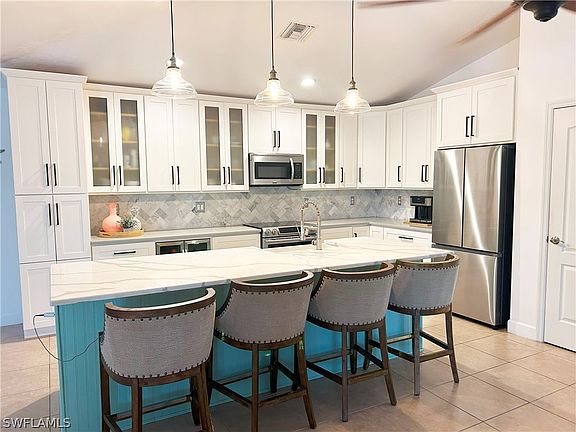 This beautifully renovated Floridian pool home offers 3 bedrooms, 2 bathrooms, and a 2-car garage. The property comes with a brand new tile roof, stylish hurricane shutters, a screened lanai (with No-see-Um screening), and a fenced backyard. Recent upgrades include luxury vinyl tile flooring in the guest bedrooms, modernized bathrooms with new vanities, tub, and tiled shower, and upgraded toilets. The kitchen has been completely transformed with white cabinetry, iron hardware, quartz countertops, a new wine fridge and refrigerator, a marble tiled backsplash with herringbone set, painted island with farm sink, & wine rack. The front living room features crown molding & a built-in bookshelf for displaying and storage. The front door has been replaced with high impact glass door, allowing ample light into the home. The primary bedroom offers a barn-style sliding door to the ensuite bathroom and French doors leading to the pool area. Both the family room and primary bedroom have a shiplap feature wall. Even the garage floor has been coated with epoxy. These renovations have completely transformed the interior, resulting in a bright, clean, and well-maintained home that will surely impress buyers. The flow from the living room to the great room creates an inviting atmosphere and provides privacy for guests. The primary bedroom is located at the back of the home, while the other two bedrooms are situated at the front. Burnt Store Lakes community offers exclusive access to a canoe/kayak launch ramp that leads to Burnt Store Marina and Charlotte Harbor as well a playground, fishing dock, and monthly potlucks. Residents enjoy eleven freshwater lakes for fishing, miles of bike trails, & birdwatching, with frequent sightings of Eagles, owls, and ospreys. Conveniently located near the historic town of Punta Gorda, this neighborhood provides easy access to shopping and dining options. Popular attractions include Fisherman's Village, the Farmers Market, Celtic Ray, Carmelo's Italian Ristorante, FM Don's, Laishley Park, & Riverwalk. The neighboring community, Burnt Store Marina offers two on-site restaurants, a 27-hole golf course, and boat slips. For those seeking a more active lifestyle, there is the option to join Burnt Store Marina Social or Golf membership. Freedom Boat Club members, conveniently launch from both Burnt Store Marina & Fisherman's Village. Both the Burnt Store Lakes community and Marina are golf cart friendly. Punta Gorda is a hidden gem that will capture your heart, and once you experience its charm, you may never want to leave. The property does NOT REQUIRE flood insurance. In addition, the corner lot next door is available for purchase, which provides space for dogs, building a guest home, extra storage for boats and RVs, or privacy. Now is the perfect time to make this paradise your home.