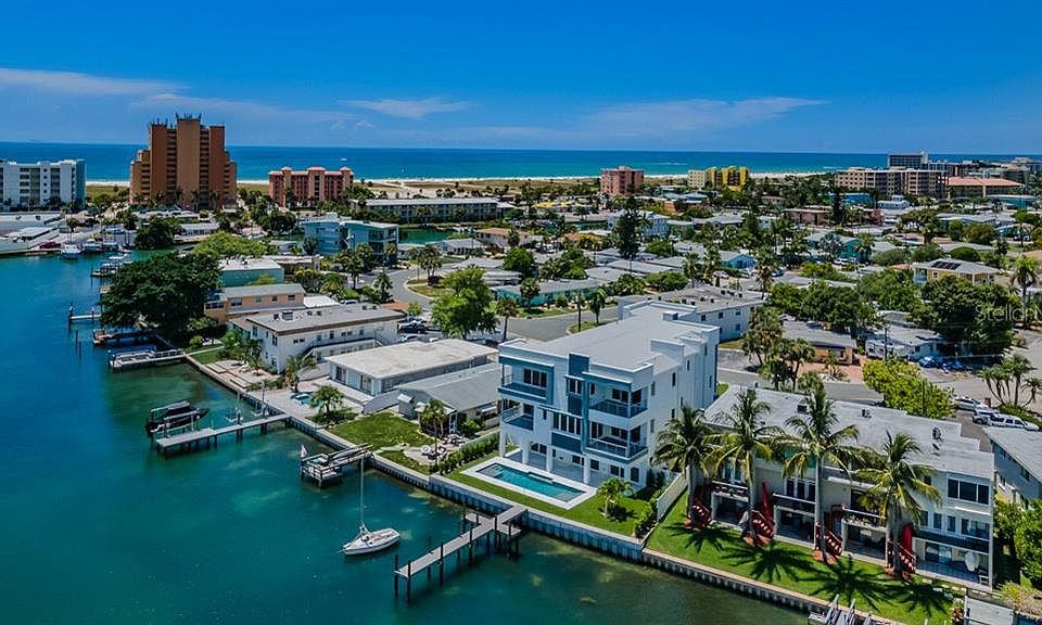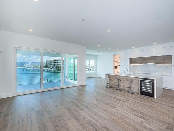 One or more photo(s) has been virtually staged. BRAND NEW LUXURY WATERFRONT CONSTRUCTION LOCATED JUST A FEW MINUTES WALK FROM THE POWDER SOFT SANDS OF TREASURE ISLAND BEACH! You'll love this fabulous coastal modern luxury waterfront home. With an impressive 10 bedrooms, 8 full baths and 2 ½ baths and many, many exceptional features, this is quite likely the best new construction waterfront value on the market today! Elegant porcelain and engineered hardwood floors are richly finished in a wonderful driftwood style. The grand waterfront great room opens to a terrific covered balcony overlooking a wide bay. Plush, state-of-the-art kitchens boasts gorgeous quartz surfaces, elegant Jenn-Air stainless steel appliances, extensive cabinetry, center island breakfast bar with beverage chiller - all finished with a lavish Euro-style minimalist appeal. Beautiful water views are enhanced by the splendid indoor-outdoor dining experience offered by this amazing home. Each 1st living level also includes a guest bedroom suite and a large media room/office with private balcony. The brilliant upper level owner's suites opens to a private covered balcony with breathtaking intracoastal waterviews that stretch more than a mile wide. Luxurious owner's baths are a pampered treasure - unique water views and masterful floor-to-ceiling tilework support a fine soaking tub, walk-in glass shower enclosure, dual vanities with quartz counters, a private water closet and a superb walk-in closet with fine closet system and center island dresser. All bedrooms are well-finished and all baths, gracefully appointed. You'll appreciate the 3-stop elevator, full service "bedroom level" laundry room and epoxy floor garage. A huge multi-purpose, lower level fitness/game area opens to a superb covered deck with exquisite paver tilework and a dazzling Pebbletec pool with 2 sunshelves. Updated seawall supports a newer composite dock that provides rapid access to the Gulf of Mexico. A terrific value and exceptional waterfront residence located close to fine dining, shopping and entertainment. 'The room and area dimensions are approximations. Buyer to verify.''The room and area dimensions are approximations. Buyer to verify.'