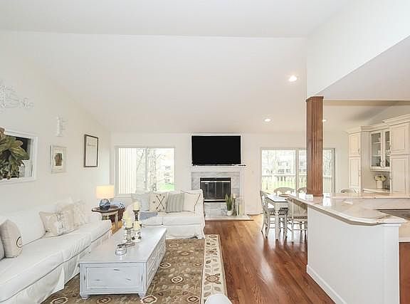 Perched on one of the highest points in Lake Barrington Shores overlooking the 11th fairway, this rare Eastwood model has it all beginning with the private courtyard entry with new landscaping, fencing and paver walkway. From the moment you walk inside, you will recognize this home's thoughtful high-end finishes and attention to detail. The main living area has an open floor plan, vaulted ceilings and recently finished hardwood flooring that runs throughout the first floor. The fireplace and new custom built-in hutch in the dining area adds to the charm. The kitchen overlooks both the dining and living room areas and boasts new quartz countertops, custom backsplash and sink and is complemented by a full suite of stainless appliances. Light floods in through the expansive windows and sliding doors off the dining area that lead to the balcony and the spectacular view of the 11th. Just adjacent to the kitchen is a den with new sliding doors to the private courtyard. Down the hall you will find the conveniently placed laundry room with a new washer and dryer set, second bedroom and hall bathroom with a comfortable jetted tub. The private master suite is a few steps farther with plantation shutters, a walk-in closet and master bath with a double sink vanity with new faucets and large walk in shower. The walk-out lower level has plenty of additional living space that includes the family room with a fireplace and sliding doors to a patio overlooking the fairway and is amazingly light and airy. A built-in bar with a sink and mini fridge makes for convenient entertaining and the exquisite wine room made of mahogany is a showstopper. This level also includes an exercise area, 2 bedrooms, a full bath and storage room. The electric/circuit box and lighting has been added to and upgraded throughout. The 2-car heated garage has direct access-uncommon in LBS. With over $60,000 in upgrades in the last 2 years this exceptional home is move in ready. If that is not enough, enjoy a
