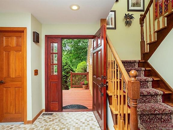 Comfortable and cozy contemporary nestled on a private setting with lovely plantings and private back yard for enjoyment. Relax in the hot tub secluded on a private patio/terrace. Peaceful deck off the master bedroom plus spacious exterior deck for grilling and entertaining. A gently sloped back yard is ideal for playing outdoor games. Custom maple cabinets and quartz counters ~ alabaster hanging lights ~ stainless appliances plus spacious pantry complete the open kitchen which flows into a sunporch area with skylights and a cozy family room with fireplace and slider to the rear deck. Spacious master suite with walk in closet and full bath with shower and whirlpool tub. 3 additional bedrooms with upstairs laundry. Additional space in the lower level ideal for a rec. room and storage. Conveniently located in the southern part of North Stamford just off Long Ridge Road with easy access to the Chestnut Hill Park and Merritt Parkway with plenty of shopping options and restaurants just minutes away. Partial generator ready. A delightful place to call home.