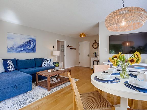 The living room connects to a lovely patio with a teak bistro table and chairs. The numerous windows allow for lots of natural light, bringing the outdoors and breezes indoors. There is a large screen, smart TV, electric fireplace and sleep sofa bed for a guest in the living room.