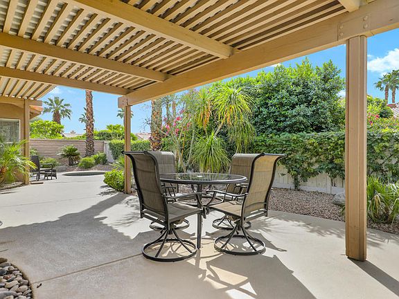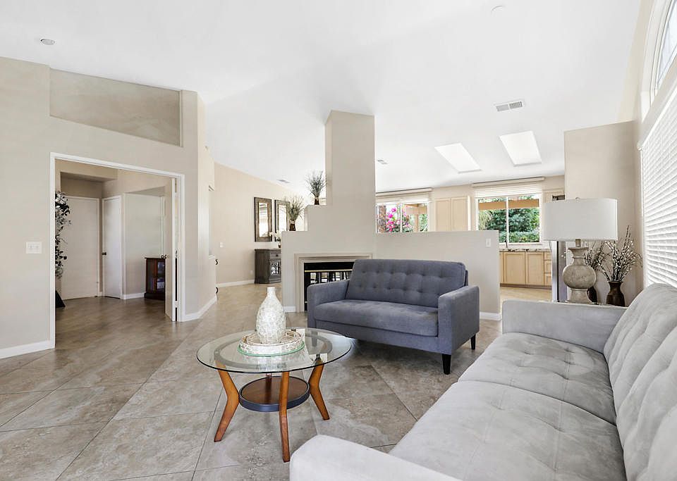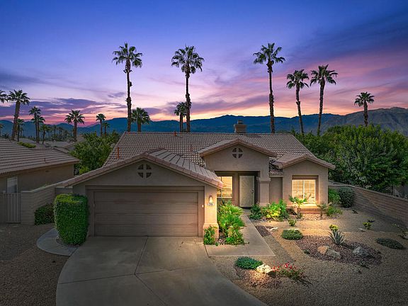 CONTEMPORARY Interior design with Open Concept featuring high-ceilings! Recent upgrades include 24'' square tile flooring throughout, fresh paint, granite counter top, stainless steel appliances, updated pebble tech spa, front desert landscape with automated drip irrigation, and AC compressor! Detached home located on quiet cul-de-sac in PRIME Palm Desert central location behind gates of a fiscally managed HOA* of just $90 month! Very private yard offers covered patio, sun lounging area, outdoor dining table, mountain views, and lush desert landscape in low maintenance yard. This tastefully appointed bright clean home currently presents dual fireplace to Living area and separate Dining / Family Room with large glass slider and window overlooking patio area. Additional seating in double sided Breakfast Bar. Primary bedroom featuring glass slider stepping out to your own in-ground spa, dual corner windows, oversized walk-in closet and private two sink bath. Guest room en-suite direct access to hall bath. 3rd bedroom opens to hall and living area. Indoor laundry with doorway to private 2 car garage. Palm Desert Merano gated Community of 126 homes is just across the street from wonderful groceries and eateries, while just a short drive to Eisenhower Heath Campus, Box-stores to north and wonderful El Paseo Shopping District, the desert's premier luxury shopping and dining destination to the south. Only 10 miles to Palm Springs International Airport.