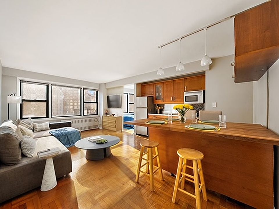 Enter the foyer of this sunny alcove studio offering a wall of south-facing windows. A spacious kitchen with ample storage and deep drawers opens into the living room. A natural wood island defines the dining area, separating it from the living area. The island can be moved and is ideal for chefs who love to cook and entertain. A windowed alcove accommodates a Queen bed, and offers 2 floor to ceiling closets and a tinted glass divider separates it from the living area. A bathroom is adjacent to the sleep alcove.
