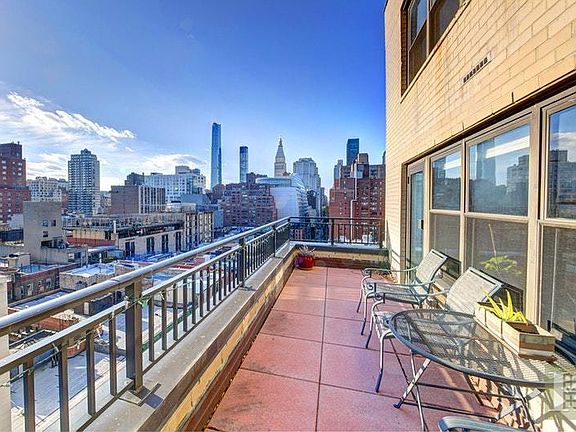 Soaring Views Rarely available: Spacious and chic, this jumbo-sized one bedroom home, with a private, setback terrace, the entire width of the home, offers stunning views from the One World Trade and The East River to The Con Edison and Met Life Towers and Empire State Building. Enjoy bright light all day long with South and Western exposures, in the grandeur of a completely gut renovated home. The open kitchen is windowed, and features a large, Caesar Stone breakfast bar along with stainless appliances including a Bosch Dishwasher. There are gorgeous, wide wood plank floors throughout, including in the king-sized bedroom with a wall of closets and bright southern exposure. You will love all of the storage space and beautiful bath too. All of this in Spruce Ridge, a pristine, 24HR doorman building with a beautiful roofdeck, card-operated laundry room conveniently located on pretty East 25th Street, between 2-3rd Avenue in a lively, bustling neighborhood of Kips Bay, two blocks north of Gramercy, surrounded by a myriad of restaurants, shops, parks, and easy transportation. Board Interview is required. Don't Miss!