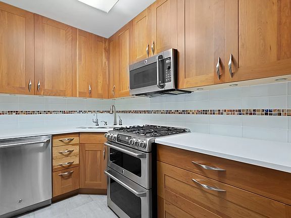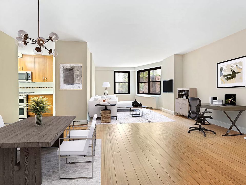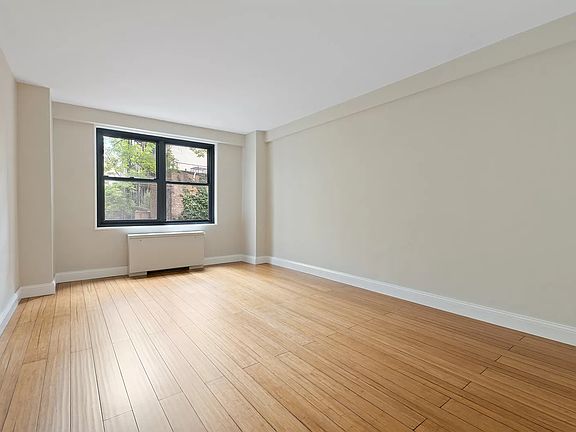 Apartment 3A, is an oversized one bedroom featuring newly renovated bamboo floors and a grand 25-foot living room that allows for easy entertaining and comfortable work-from-home options. You'll enjoy peaceful views of the tree-filled courtyard and the golden roof of the New York Life Building glimmering in the distance. The kitchen is elegant, with GE Cafe appliances, warm maple cabinets, glass tile backsplash and Caesarstone countertops. As is the spa-like bathroom, designed with glass mosaic tile, a Caesarstone counter, Robern double-mirror cabinet and Toto toilet. The bedroom is extensive, easily accommodating a king-sized bed with room for proper furniture and an office desk. The Spruce Ridge House is a classic Kips Bay full-service co-op with 24/7 doorman, a live-in super, central laundry and a lovely landscaped roof deck with city views. The building does not allow pied-a-terre purchases but gifting is considered. Some images are virtually staged.
