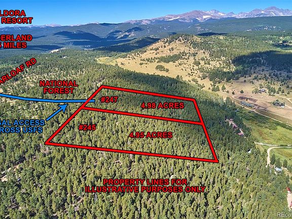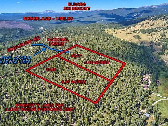 Five PRIVATE acres adjacent to USFS land with amazing Continental Divide views! Potential views surround this FLAT & sloping topography with a healthy diverse forest and many rock outcroppings. A perfect location only 3 miles to Nederland & 14 miles to Boulder. Transferable Forest Service easement with a rough driveway in place. All corners are flagged. This parcel must be purchased in conjunction with MLS 4354865. Access is from Sugarloaf Rd. Well/Septic needed.