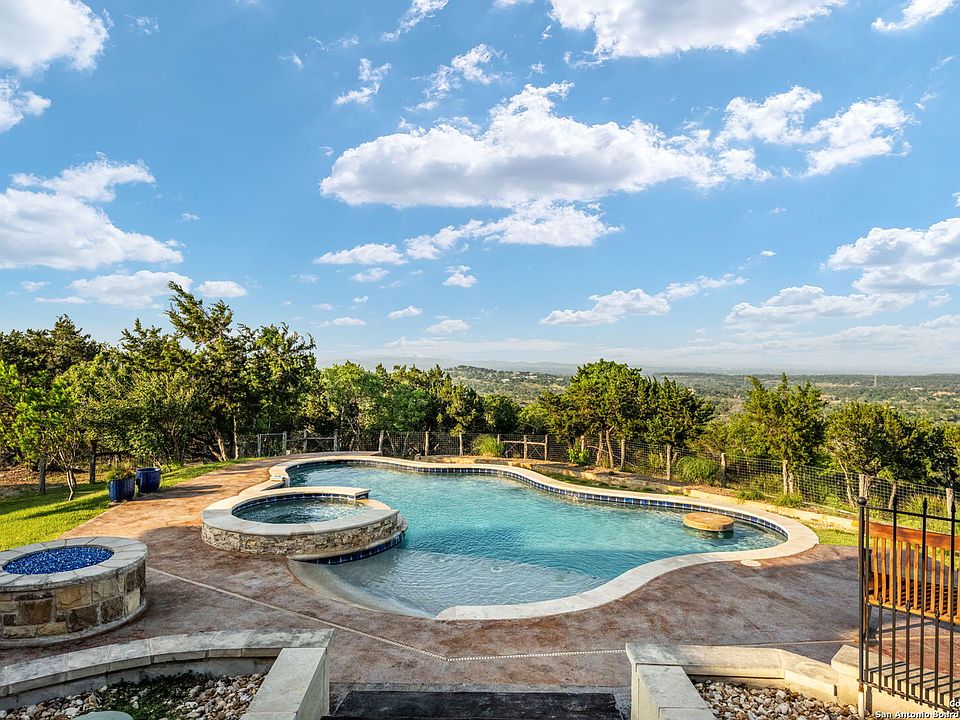 This spectacular Hill Top Oasis offers simply the best of Hill Country living...easy living one story floorplan w/spacious room sizes; panoramic views and amenities galore. Work from home or homeschool? No problem w/dual offices & high speed fiber internet! Entertaining is fun w/the open floorplan, chef-ready kitchen (KitchenAid Gas Cooktop, Double Ovens, Refrigerator) and huge pantry. A butler's pantry + bar area offer wine & beverage coolers. The Owner's Suite is restful w/Fireplace, views and spa-worthy bath w/heated floors. An In-law suite features kitchenette, TV, private access and is connected to the home. The other bedrooms are spacious & feature ensuite baths. An expansive covered patio is open to the views and has outdoor grill station w/beverage cooler & sink. The refreshing saltwater pool offers beach entry, spa tub and breezy views. This property is a dream for woodworkers and/or car lovers w/an oversized garage w/connecting workshop w/overhead door and built-ins + detached oversized 2 car garage w/adjoining smaller garage perfect for ATV or lawn equipment. These owners have thought of everything...a versatile Pet Parlor w/separate washer+dryer has access to pet yard-perfect for dogs or chickens! (could double as 2nd laundry/mudroom), built-in Gun Safe, lightning rod protection, propane generator and extra 12' x 20' Storage building! Live the Texas Hill Country lifestyle!