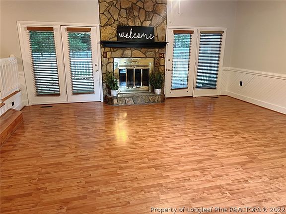 Charming Ranch Style Home on a Beautiful Large Corner Lot! Fresh interior Paint! Check out this three-bedroom, two-bath home featuring formal living and dining spaces, a large eat-in kitchen with plenty of cabinet and counter space, good size bedrooms, and an attached garage. Livingroom has a double exit french-doors to the deck and tons of natural light. Great for entertaining. Beautiful laminate flooring. Fully fenced yard with deck and plenty of shade. This spacious primary suite features a walk-in closet,  double vanity, and glass door to the backyard. The home is on the north side of town with quick access to Fort Bragg, Cape Fear River Trail, schools, restaurants, and shopping plazas. This beauty is located in the desirable Kinwood subdivision.