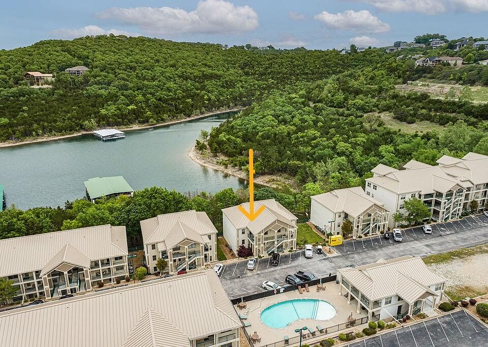Privacy AND Convenience in Table Rock's Premier Destination: Emerald Pointe! Just off the 'main body' betwixt Branson Belle & Big Cedar but tucked away in a private, quiet cove. Walk-out level fully furnished condo has NICE year-round lake view. Just 11 min drive to civilization...:) Inside: You'll love the tall ceilings, wide open kitchen with custom cabinetry, roomy dining and living areas with cozy gas fireplace, pretty lake views from living, main bedroom and patio. Step right out the glassed patio to an easy walk to water's edge, or up to the zero entry saltwater pool (new 2017). Two large bedrooms, two luxurious baths. Updated luxury vinyl plank floors. Small fridge & microwave in second bedroom, can be 'lock-out' for use by 'Cousin Eddie'...;) Cable High Speed Internet & TV avail! Recent exterior updates incl roofs & siding. Very nicely managed. Use the nearby dry dock, boat launch and courtesy dock, or buy 12'x30' third party boat slip (coming 2023!) nearby for $55K. Gated subdivision has clubhouse, pool (#2) and tennis courts with regular get-togethers like book club and potlucks, workout room. Don't like the idea of strangers sleeping in YOUR bed? This unit is NOT approved for nightly rental. LOOK for 3D Virtual Tour...