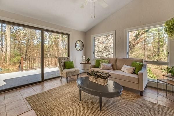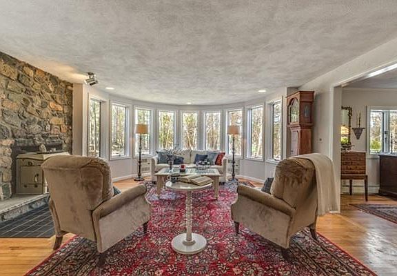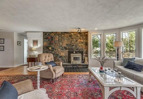 In a peaceful wooded setting you'll find this lovely light filled 3 bed, 2 1/2 bath contemporary home. Enter mahogany deck & appreciate intricate wood design on deck & front door. Entryway offers two coat closets for storage & leads to spacious LR w/bow windows & gorgeous stone framed fireplace. Stunning sun room w/oversized sliders drench space w/sunlight & lead to composite deck & gardens.Chef's kitchen w/ Viking stove, Sub Zero fridge, butcher block island & many built ins including several floor to ceiling cabinets w/pull out shelving & handy built in desk nook. Eat in kitchen area overlooks trees & nature thru bay window. BR w/bay window & en suite full bath & addt'l BR w/fireplace complete first floor. Up the sunlit stairs you'll find special spacious master bed w/bow windows, ceiling fan & skylight.Master bath boasts jacuzzi tub & separate shower. NEW septic to be installed.Plenty of addt'l space in finished basement w/office, FR w/pellet stove, large workshop & private sauna!