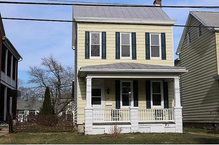 Ready and waiting for you; this 2-story farmhouse has been recently updated with oversized 2-car garage which was converted into a 1- car garage with workshop equipped with water, electric and heat and can be easily converted back to a 2-car garage. Covered front porch greets you and your guests or is a great place to watch the day go by while enjoying the afternoon sun. Open living and dining room area with tall ceilings is a great place to hang out. Lots of new replacement windows let the light pour in. Half bath on first floor with barn style door is a great accent to the room. Updated kitchen has tiled backsplash and lightly used range and new dishwasher. New paint and flooring throughout the home is a real plus. Upstairs has 3 private bedrooms and remodeled bathroom with tiled flooring and walls. Walk-up attic provides great storage or possible fourth bedroom. Covered back porch is a great place for the grill. Backyard has room for your garden. Detached 2-car garage gives you plenty of parking and storage. Available today! Welcome Home!