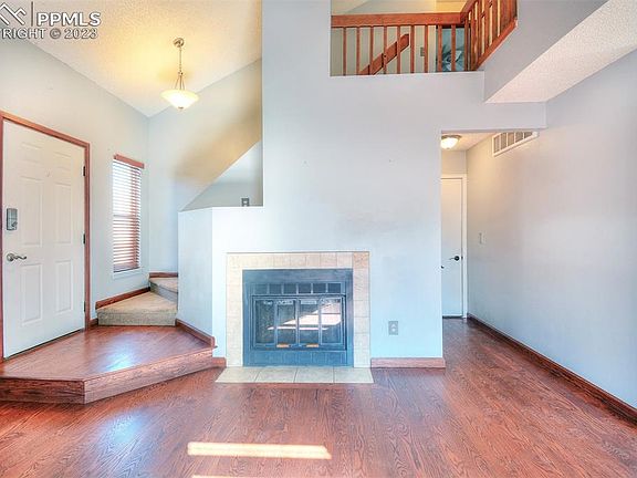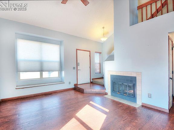 This two story home sits on a cul-de-sac with a fully fenced backyard and a two car garage. Upon entry you are greeted by warm hardwood floors, a spacious living room with a wood burning fireplace and vaulted ceilings. The kitchen includes tile floors, stainless steel appliances, custom cabinetry and a walkout to the backyard. Upstairs are two bedrooms with plenty of natural light and beautiful mountain views out of the master. The full bathroom is conveniently located just steps from both bedrooms and offers a tub/shower combo. The basement is a great spot for guests as it can be used as a large bedroom with an adjoining bath or an addition family room. This home is located just minutes to Fort Carson, the new Amazon building and the Colorado Springs Airport! Also enjoy the pool that is part of the HOA and is located just across the street. Don't miss this opportunity to move into a beautiful home in the desirable Fountain Valley Ranch neighborhood.