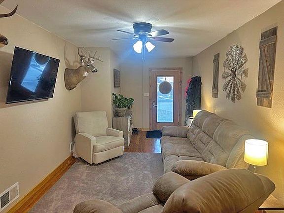 This beautifully updated home is on a corner lot. It features everything you need on one level! A nice-sized living room and three bedrooms, all with wood flooring, a full bath with tile floor, gorgeous cabinets and a tile floor in the kitchen, and laundry just off the kitchen. A two-stall insulated garage with heater and a/c unit. The outside has vinyl siding and gutters. Home also has newer heating and a/c units. Call to look today...this one won't last long!