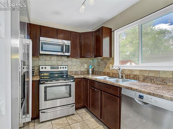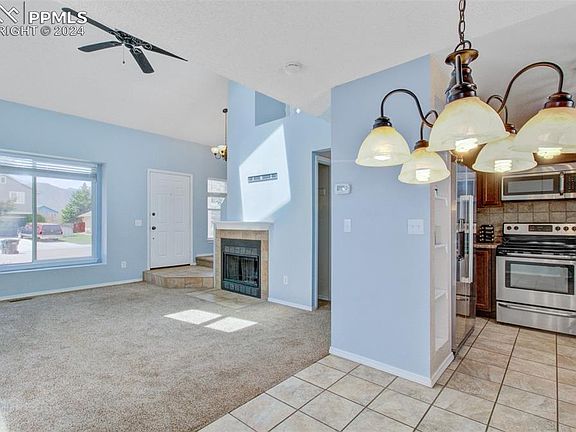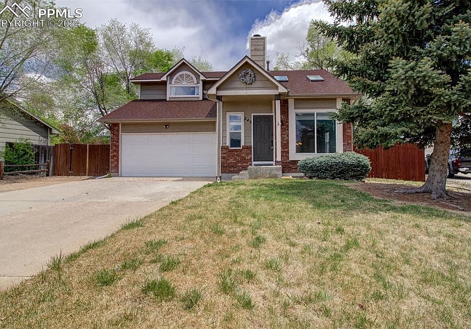 Welcome to this fun 3 bedroom, 2 bath located in southern Colorado Springs. This sunny home features vaulted ceiling in the living room and skylights to let in that wonderful Colorado sunshine. Relaxed living room is cozy on chilly nights with a wood burning fireplace. The living room flows into the dining room and kitchen making entertaining easy. Kitchen has lovely stainless appliances and lots of counterspace. Speaking of entertaining your guests will have the best seat on the large deck that is right off the dining room. The deck overlooks the soothing fenced back yard. Got stuff? 2 roomy storage sheds are in the backyard. Playhouse? Art Studio? Man Cave? She Shed? You decide. Upstairs features the primary bedroom with its awesome mountain view, full bath, and 2nd bedroom with large closet. In the finished basement you'll find the 3rd bedroom complete with its own bathroom. Laundry is in the large utility room in basement. Plenty of parking with a 2 car garage with shelves providing more storage possibilities. Community pool is nearby to keep cool this summer. Located close to schools, shopping and a short distance to Ft. Carson.