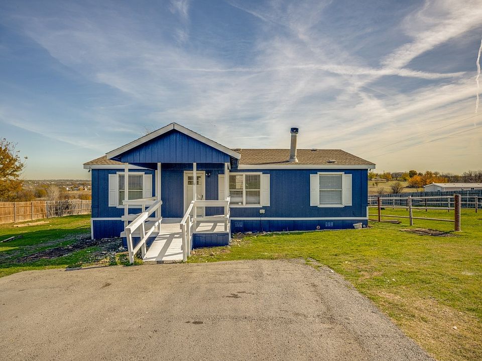 BEAUTIFULLY REMODELED AND FULLY FENCED IN PROPERTY WITH PRIVACY ON AN ACRE! This home has been updated all the way with new wood flooring, fresh paint, stainless steel appliances, granite countertops and MORE! This open floorplan features a large living area, an update kitchen with an island and custom backsplash and plenty of roof for a dining table. The split floorplan features the master suite on one side with a soaking tub, dual vanities and a walk in shower. The large covered patio on the front and the open back patio overlook the land. Bring your animals, projects or whatver you'd like as the full acre is fenced in and there are already stalls, coops and fencing in place. Come live out in the country just a short drive to the growing town of Rhome and easy access to 287. There are endless possibilities with this move-in home on an acre!