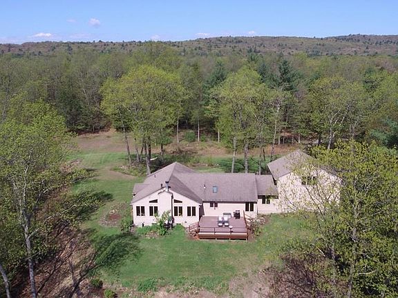 Scenic and private contemporary ranch on 9 acres wooded lot with a stunning mountain view. Excellent location-easy access to Amherst, Northampton and Greenfield. Low taxes. Custom built home with one floor living includes large living room with cathedral ceiling, fireplace/mantel. Ash hardwood floors/tile throughout home, recessed lighting. Enjoy the landscaping filled with perennials, large rear sunny deck, bird haven, golf practice area, oversized garage with loft above. Other features are Anderson windows, breakfast bar, dining room, large mud room, and handicap friendly. Corner windows bring in the beautiful views from all sides. COME EXPERIENCE THE VIEWS!!
