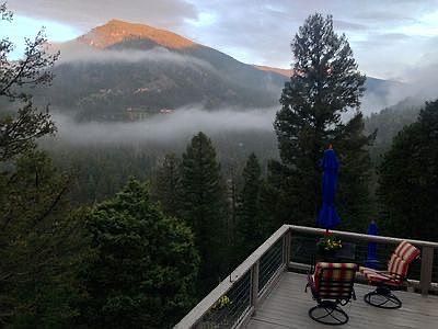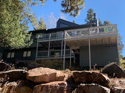 Utilities, HIGH Speed INTERNET and Water INCLUDED In rent. 2500 square ft furnished or unfurnished contemporary Mountain home with spectacular Mountain views on 1.98 acres with close I- 70 access for easy commute to Denver, DIA . You will love the private resort feel of our property, loads of privacy -hiking and cycling out your door, home with beautiful natural light, 10- 20 foot beamed ceilings, open floor plan - great for entertaining and family life. 1100 sq. ft. wrap-around decks. to enjoy stunning views and nature. Two moss rock fireplaces - one magnificent fireplace in living room is floor to ceiling. Three bedrooms, two bathrooms, plus library/ office, family room, dining room, living room, laundry room, pool table room, custom 12 X14 kitchen, two patio doors leading to decks. Stainless steel appliances, Four huge walk-in closets, Two- car plus attached garage and plenty of additional outdoor parking. Asphalt driveway facing south. Ponderosa Way is a paved dead end road off the well maintained Stagecoach blvd that services a nearby award -winning school less than two miles away. Quiet, Private, Serene property. Elk, Deer, Fox enjoy our property too. Under four miles to Elk Meadow Open Space Park, shopping, restaurants and RTD to Denver. Eight miles to Evergreen Lake and downtown quaint Evergreen. 20 miles to Echo Lake - the picnic, hiking, fishing jump-off point for the 28-mile scenic road to 14, 264 ft. Blue Sky Mountain. Tenant responsible for garbage service, and removing (sweeping, blowing, shoveling) snow from decks, stairs, and asphalt driveway or paying a service to remove snow - tenant choice. Landlord pays for monthly hot tub maintenance. Tenant is responsible for educated use of hot tub, keeping hot tub clean and safe, and in chemical balance when using it in between monthly professional maintenance. Tenant is responsible for communicating with landlord promptly if any issues with the hot tub or any part of the home. Note: There is a convenient RTD bus service four miles from home with parking and carpool. No smoking no vaping inside or outside home.. special arrangement for well trained dog. Lease is flexible - 3,6, months to one or two years. (Currently two of three bedrooms are furnished. (If tenant desires completely unfurnished or furnished - that's easy! ) The basement level, separate entrance private apt with bedroom and bathroom is not for rent. One of the three main floor bedrooms currently serves as an indoor fitness room with treadmill and stationary bike. Easy to store this equipment elsewhere if tenant desires the third bedroom for another use. Text, call or email to arrange a tour. Tenant responsible for snow removal and garbage service. Two month, 6 month, 1 year to two year lease available. Well behaved dog is possible. Absolutely no smoking or vaping anywhere inside or outside on the property.