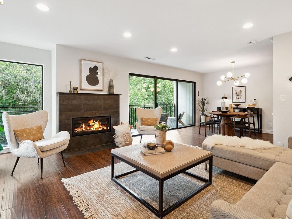 This level-in, end-unit contemporary townhome is situated in the Crestmont neighborhood of the Oakland Hills. This stylish three-bedroom, two-and-a-half-bath home has lovely serene, wooded views. Dramatic dark floors, elegantly updated baths, and a modern fireplace in the living room are some of the home's lovely features. The primary suite is a private oasis with soaring ceilings, a spa-like bath and walk-in closet. Gatherings with friends and family are easy with the spacious, open floor plan. For outside enjoyment, there are two west-facing private decks perfect for enjoying a cup of coffee in a beautiful, natural setting. The two-car garage has interior access directly into the chef's kitchen with stainless steel appliances, quartz countertops, designer backsplash, and ample storage. The sense of community is unparalleled with neighborhood events like summertime ice cream socials, lively holiday parties and freshly baked Sunday treats by a generous resident! With easy access to shopping and transportation, this special home is also moments away from the Oakland Hills Swim and Tennis Club, Chabot Space and Science Center, the Oakland Zoo, Merritt College, Redwood Regional, and Joaquin Miller parks where one can enjoy hiking, biking, and dog walking trails.