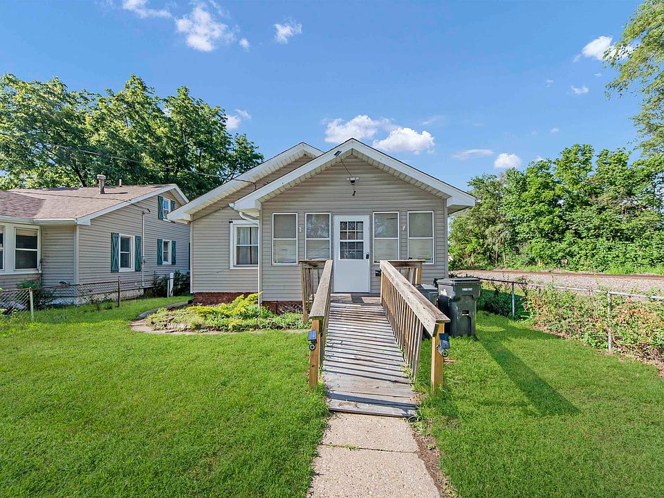 Come take a look at this ideal first home or quality investment property on a quiet dead end street with 2 bedrooms that conveniently share a full bath. The dry, spacious partially-finished basement boasts the possibility of two extra bedrooms or can be used as office or storage space. Cute enclosed front porch, fenced yard, on-street parking and an oversized detached garage with alley access. This clean well maintained home offers many recent updates including wiring, countertops, backsplash, vinyl flooring, carpet, new paint, light fixtures, ceiling fans, and replacement windows. Hot Water Heater 2018, Furnace 2001, Roof layover 2023, Window Units stay and cool this home wonderfully in the Summer months. Hot tub stays and functional, waiting for its new owners. Ramped zero-step entry for convenient accessibility. Home and appliances sold as-is and inspections welcome. This home is move-in-ready and Seller is motivated. Same owner for nearly 25 years.