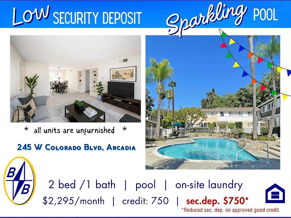 Spacious 865 sq. ft. apartment in a sought-after community. Enjoy natural light in every room. Bathroom features ample counter space and storage. Living room offers built-in shelves, and kitchen includes off-white cabinets, black stone countertops, and white appliances. Beautiful grounds with pool and on-site laundry. Near the 210, Santa Anita Racetrack, Trader Joe's, and The Shops at Santa Anita!