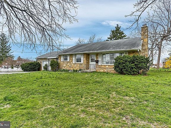 Solid Stone Rancher located minutes to the MD lines on a corner 1/2 acre lot . X-Large rooms and over-sized 1 car garage. Bright and sunny living room with stone fireplace, bow window and it appears to have hardwood flooring under the carpet. Spacious eat in kitchen with breakfast bar and table space. Updated bath vanity. Both bedrooms feature hardwood floors and plenty of closet space. Sunroom could be a dining space or den. Cedar closets. laundry chute, and walk-up attic. Lower level family room that is partially finished with Another Stone Fireplace. Huge laundry room, storage room and 2nd bath. Natural Gas heat, Central Air, Replacement windows, oversized garage covered patio and porch, shed. Large yard, easy access to shopping, restaurants and medical facilities. Must see!!
