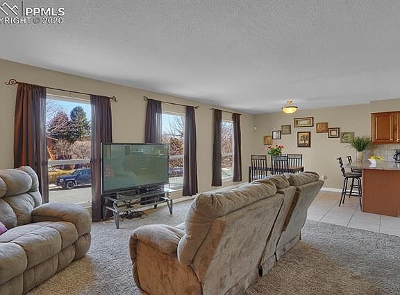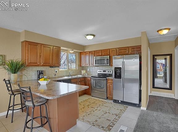 Charming side entry bi-level on a cul-de-sac is move-in ready and waiting for you to make your own! Enter the home into the spacious main level foyer with access to the attached garage and fully-fenced backyard and a hall closet for storage. Just a few steps up you will find a bright open-concept floorplan with a large living area that features a wall of windows letting in tons of natural light! The spacious kitchen has solid countertops, stainless steel appliances and ceramic flooring with a fun patterned tile inlay! The kitchen has a counter bar with additional seating and is sure to be the place friends and family will gather to catch up! Adjacent to the kitchen is a dining area to enjoy your meals! The master bedroom on this level has private access to the full bathroom and beautiful mountain views! Bedroom number 2 completes this floor. The lower-level has a huge family room with a dry bar to entertain at. There are two nice sized bedrooms and a large bathroom with a walk-in shower that can be accessed from each side so that it's adjacent to both bedrooms making it so convenient! The large backyard is fenced and has spectacular mountain views and a storage shed for all your belongings! Central Air, auto-sprinkler system and window treatments are just some extras this home offers. Close to the Powers Corridor with it's many shops and restaurants, Colorado Springs Airport, Peterson Air Force Base, Ft Carson Army Base and so much more! Come and take a look today as this one won't last long!