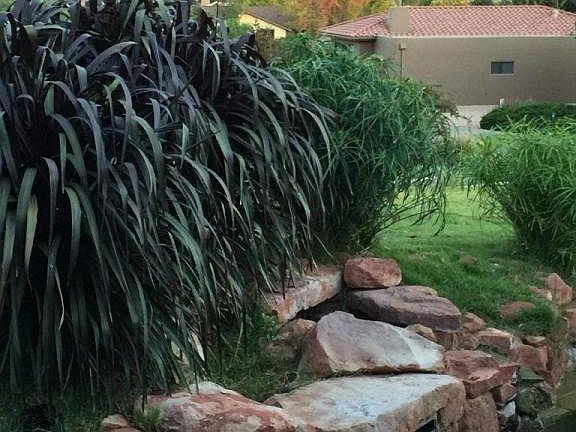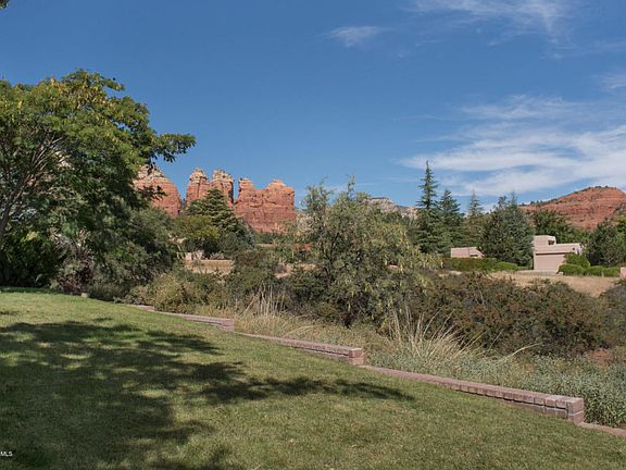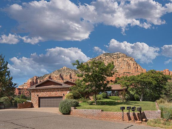 This lovely 4 bedroom, 4 bath warm inviting home is tucked away on a quiet cul-de-sac nestled amidst towering red rocks in a desirable West Sedona neighborhood perched high on a large beautifully landscaped lot with a serene babbling brook water feature at the entrance. Master suite & bath plus 2 guest rooms with a full bath between are nicely separated from the main living level, plus a convenient 1/2 bath near the living room and kitchen. Custom tile master bath and huge walk in closet in the master suite. Travertine, hardwood & tile floors, Royale Negre marble kitchen countertops, Jenn-Air range, all appliances are included. Huge family room on a slightly lower level with fireplace, office with separate entrance, full bath adjacent to laundry room & garage, and a private covered patio