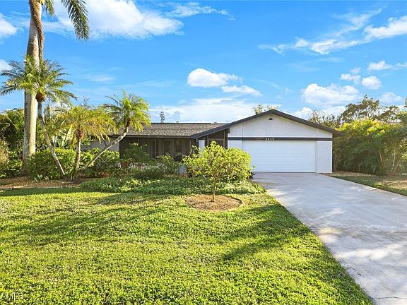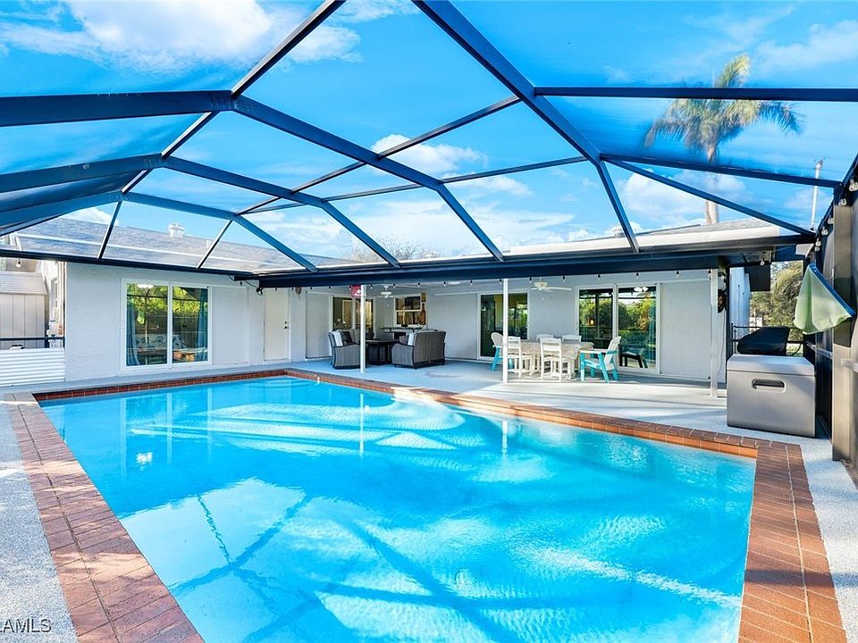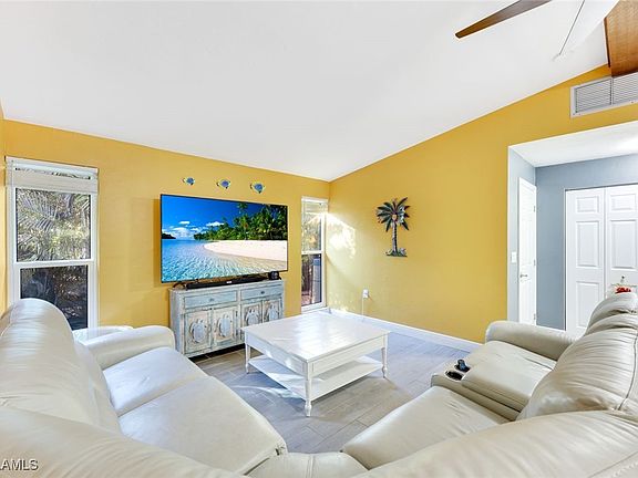 Updated 3-bedroom, 2-bathroom pool home boasts 1,770 square feet of living space with a thoughtfully designed open floor plan. Modern finishes and tile flooring throughout create a seamless flow. A large island in the kitchen is the perfect spot for guests to gather around. The sleek stainless-steel appliances are ideal for cooking enthusiasts who like to entertain. Enjoy peace of mind with impact-resistant windows and doors. Step outside to your private oasis; a newly refinished pool deck surrounds the sparkling saltwater pool surrounded by a no-see um blocking super screen enclosure; a great space to relax or host gatherings. The lush, fenced and private backyard features mature fruit trees, including avocado, cherry, lime, coconut, and mango, offering both shade and fresh produce year-round. Centrally located, this home is in close proximity to numerous restaurants, entertainment venues, and shopping centers. A short drive to some of the best beaches around and just minutes to Southwest Florida International Airport, makes this home perfect for both permanent residents and seasonal visitors.