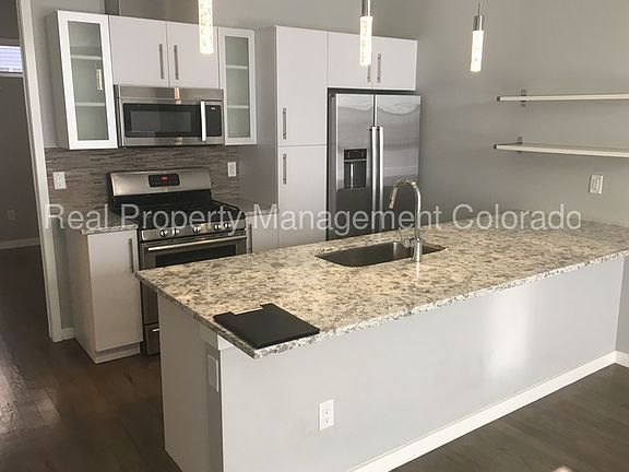 Amazing unique 3 bed 3 full bath row home in prime location! This gorgeous unit is ready for quick possession and is blocks to Jefferson Park, Sartos, Briar Commons, I-25 and Broncos stadium and has incredible views of downtown. The unit features 3 bed/baths all on their own level and a large two car garage. There are beautiful hardwood floors throughout the entire home. The kitchen has an open floor plan, Bosch appliances with a gas cooktop, custom white and grey quartz countertops, and great natural light. The master features a large walk in closet and is situated next to the laundry room. Other highlights and upgrades include custom tile in baths, wood blinds, surround sound and gas hookups on the deck, added ceiling fans in all bedrooms, custom vanity in lower bath, and fireplace in living room!