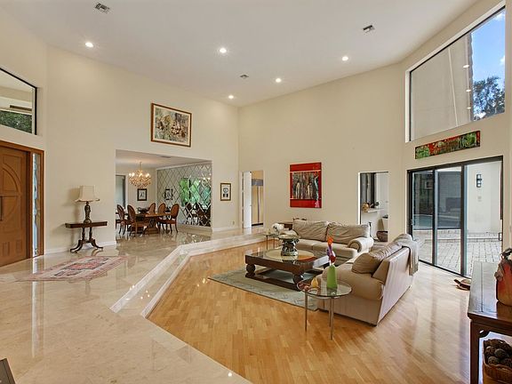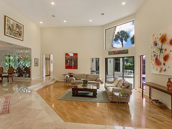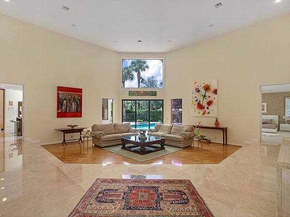 Best priced estate in Les Jardins..on large interior cul-de-sac lot. With volume ceilings, 8ft doors and massive hexagonal living room, 4 bedrooms, 3 full baths, split bedroom plan and completely renovated in transitional decor. 4th bedroom being used as Library. Large family room with floor to ceiling coral stone fireplace. Tranquil outdoors with total privacy and lush landscaping. All hurricane impact sliding doors. Shows impeccable and with pride of ownership.
