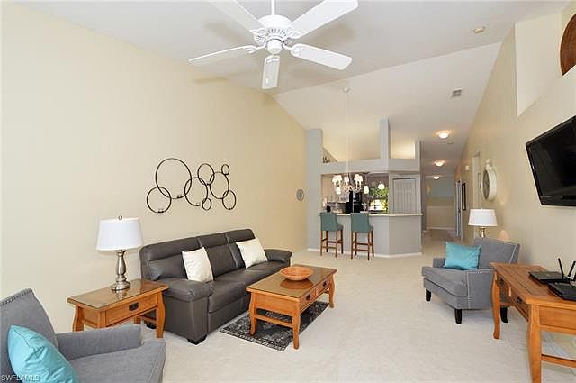 Your most discriminating buyer will not want to miss this just-updated bright and light "cream of the crop" in Pipers Grove or probably anywhere in N. Naples in this price range! All NEW Karastan carpet with Scotchgard and limited 25-yr warranty, paint, and brand new contemporary quartz countertops! Both kitchen and bath cabinets were refaced with Martha Stewart raised-panel doors 1-2 years ago and pendant lights added over the breakfast bar. Sought-after Southern-exposure wide lake/fountain view! Electric storm shutters conveniently protect the lanai! Air conditioning was replaced in 2014 and the ductwork was replaced last year, along with adding a UV light. You'll love the high ceilings, just-cleaned grout, and the brand new tasteful furniture which is included in the price! Washer/dryer replaced 3-4 years ago and microwave new in 2017. All new roofs in this association (there are 2 associations), and this one is fully paid for! This condo is an easy walk to the wonderful amenities, including huge pool with lap side and separate "fun" side (and another smaller pool), lit tennis courts, exercise room, large community room with kitchen, fishing pier, and activities like bocce.