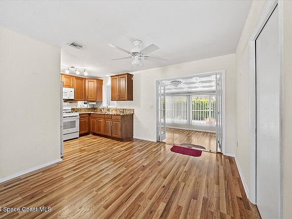 This charming 3 bed, 2 bath coastal home on CITY WATER & SEWER is located in the highly desirable NE Palm Bay just seconds from the Indian River and only 15 minutes from the closest beach. As you walk through the front door, you're graced with an open floor plan leading to the kitchen and out to the sunroom. Off the sunroom is a spacious courtyard ideal for outdoor entertainment, sunbathing, or gardening. There is NO CARPET in the home. This home features a water softener and has transparent hurricane shutters, allowing for light to flow into the home during storms. There is a single car garage for parking and two driveways, allowing plenty of space for guests to park. The home has been beautifully maintained. Roof 2019. AC 2016 comes with transferable maintenance plan. Stove, refrigerator & microwave 2022. Tankless water heater 2013. Don't miss out on this wonderful place you can call home!