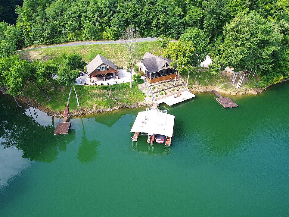 Lakefront Home in gated subdivision with private dock 2 car carport setting on 2.11 acres. New Roof 2019. 2 slip Boat dock with Patio Rooftop. Storage Building with 1/2 bath & outside shower.