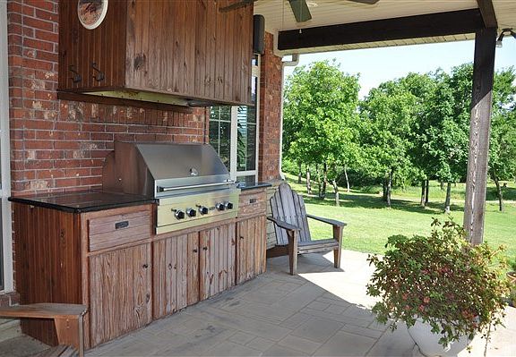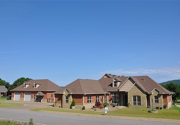 LOCATION: This home of UNPARALLELED QUALITY sits on Wolf Mountain Golf Course which is the only 18 hole golf course in LeFlore County. It is located just outside of the city limits of Poteau, Oklahoma. Poteau offers shopping, medical facilities, a college and a vocational school. The Ouachita National Forest and Wister Lake State Park are nearby for outdoor recreation. Other area points of interest include Cedar Lake Equestrian Trails, the Heavener Runestone and the scenic Talimena Drive. There is excellent hunting in the area for whitetail deer, wild turkey, black bear, wild hog, squirrel and other small game. There is also fishing in the many nearby area lakes, rivers and streams. LAND: 1.4 acres of level land. The home sits on the 7th hole and offers one of the prettiest views of the course as well as Cavanal Hill. Concrete driveways surround the home and the shop. SERVICES: Electric (Kiamichi), natural gas (AOG), rural water and well, phone, internet, garbage, mail delivery and school bus. HOME: This custom brick and natural stone home was built in 2007, and has 4,230 s.f. of heated and cooled living area with a total of 5,450 s.f. under roof. The home has many extras and many quality details and upgrades throughout. Features include an open entry/dining, huge kitchen, living room, sitting room, two fireplaces, four bedrooms, three full baths, two ½ baths, an office, game room, spacious utility room, a huge master suite, and an oversized three car garage. There is lots of outdoor living space with the covered rear porch and patio with built-in fire pit. The home has excellent storage and closet space. The countertops are all granite and there is extensive stonework throughout the interior. Room dimensions and descriptions include the following: ENTRY/DINING ROOM/PIANO ROOM: 19.6 x 29.6, This impressive open space has 10 foot ceilings, 20 x 20 ceramic tiles on the flooring, café au lait textured walls, white textured ceilings, crown molding and custom 5 inch baseboards. The entry door is wooden with attractive glass side panels. The ceiling in the dining area spans from 12 feet to the height of the roof. There are transom windows, and an ornate iron light fixture above the table area. There is ambient accent lighting in the piano room. STUDY: 11.2 x 11.2, Hunter green textured walls, vaulted tongue and groove ceiling with beams, ceiling fan with light, built-in credenza and bookcases, transom window and double glass French doors for privacy off of the entry. There is a closet that houses a tankless water heater and also has room for storage. HALL GUEST BATH: 5.6 x 5.6, Hunter green walls, white 10 foot ceilings, ceramic tile floors, antique vanity with vessel sink and commode. MASTER BEDROOM: 13.10 x 18.9, This space is light and airy and has ivory carpet, café au lait walls, white tray ceilings, crown molding and accent lighting. There are double doors that close the master suite off for privacy as well as double glass doors that open off of the suite out to the rear porch and patio. MASTER BATHROOM: 14.10 x 15.3, Taupe textured walls and white tray ceilings, 20 x 20 ceramic tile floors, a Sanijet pipeless 6 jet whirlpool tub with opaque window above and terra cotta tile surround. There are double granite top vanities with mirrors and hickory cabinetry. The 5 x 6 walk-in shower features signature Grohe fixtures with three shower heads: rain shower, traditional and handheld. There is a private water closet. WALK-IN CLOSET: 10 x 13.5, It has double doors, built-in shelving, ivory carpet, taupe textured walls, built-in shoe storage, built-in custom dresser and lots of overhead shelving. KITCHEN:13.7 x 15.6, 20 x 20 tile floors, granite countertops, custom hickory cabinetry, ceramic tile backsplashes, pull out trash storage, and large walk-in pantry. The appliances are all stainless and include a dishwasher, double sink, garbage disposal, commercial grade GE Monogram double electric oven with 4 burner gas cooktop that has a grill and griddle, Maytag double door refrigerator with freezer and ice and water in the door. An attractive floor to ceiling natural stone arched cove houses the range and vent hood. There is accent as well as under counter lighting in the kitchen. An angled bar separates the kitchen from the living area. Double glass doors exit out to the rear covered porch. LIVING ROOM: 16.7 x 22.9, Natural beam tongue and groove 10 foot ceilings, 20 x 20 ceramic tile floors, café au lait textured walls, in floor electrical outlet, built-in speakers in ceiling, natural stone Heat & Glo fireplace with gas logs, cedar mantle, and raised solid stone slab hearth. There is an attractive wall of windows that overlooks the golf course. SITTING ROOM: 9.4 x 14.8, This nook opens off of the living room and has corner windows, accent lighting and a ceiling fan with light. BEDROOM #2: 11.11 13.8, Ivory carpet, café au lait walls, 10 foot white textured ceilings, ceiling fan with light, walk-in closet with built-in shelving, and private bathroom. PRIVATE BATHROOM: 4.11 x 8.4, Tile floors, café au lait walls, white ceilings, single vanity with granite top and backsplash, oversized mirror, brushed nickel fixtures, hickory cabinetry, linen storage and a single piece tub with shower. BEDROOM #3: 10.11 x 13.6, Carpet, textured café au lait walls, 10 foot white textured ceilings, ceiling fan with light and double door closet with built in shelving. JACK AND JILL BATH: Single granite top vanity with granite backsplash, hickory cabinetry below, oversized mirror above, brushed nickel fixtures, and dual medicine cabinets. The commode and the one piece tub/shower is private from the vanity. This room has black ceramic tile floors. BEDROOM #4: 11.11 x 13.6, Carpet, textured café au lait walls, 10 foot white textured ceilings, ceiling fan with light and double door closet with built in shelving. LAUNDRY ROOM: 6.10 x 13.2, Café au lait textured walls, white ceilings, stainless sink, lots of lower ca