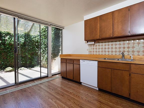 A great end unit with 1,476-sq. ft. of living area which overlooks the forested greenbelt. There is one master bedroom downstairs and one upstairs. The upstairs master bedroom has wall of attached bookshelves. There is also a large storage area upstairs, a nice relaxing deck off of the living room, a courtyard off kitchen, open beam ceiling in the living room, and newly refinished hardwood floors. Pool, tennis courts, and open walking areas in complex. This is a well maintained association and owners take pride in their units. Some units, upon association review and approval, have enclosed the patio off the kitchen, which could possibly be done with this unit.