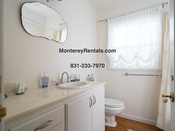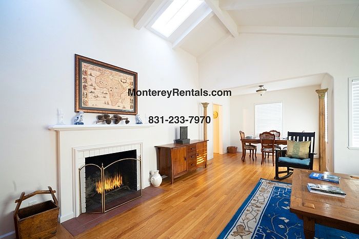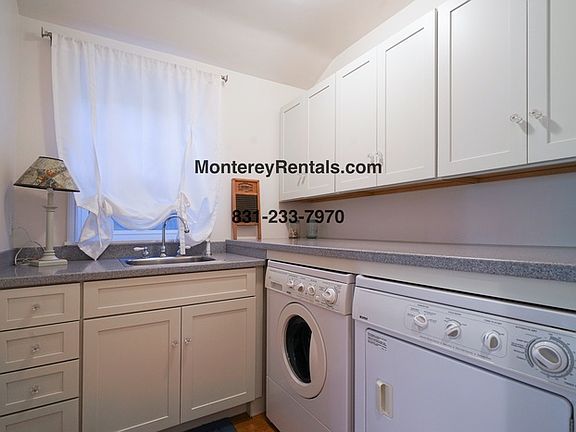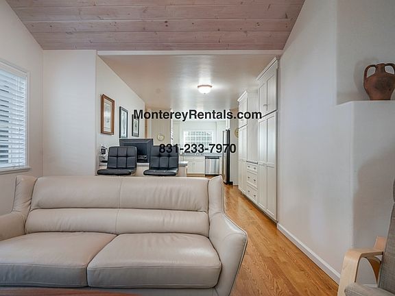 Please visit the link below to check availability. 30 day minimum stay required. Stay can not exceed 6 months. This comfortable, single story home on a corner lot in Carmel is the perfect spot from which to explore the many splendors of the Monterey Peninsula. Between the living room (with a fireplace for chilly nights) and the cozy den with a leather sofa and a large TV you'll have plenty of room to spread out here. There are two dining areas, one off the living room and a breakfast table beside the large kitchen, which features fresh white cabinetry, a stainless side-by-side refrigerator, a five-burner gas range, and built-in oven/microwave. There's a twin bedroom (with bunk beds), a powder room, an office with a roll top desk, and a laundry room off the kitchen. On the opposite side of the home you'll find a Queen bedroom facing a hallway bath with a tub/shower. Further down the hall is the master suite: Queen-sized poster bed, fireplace, and a large TV in an antique armoire. The en suite bath has an oval soaking tub, a walk-in shower and dual sinks. Outdoors, you can while away the hours in the porch swing, or dine al fresco in the large backyard under the oaks. And when you're ready to explore, Carmel's storybook downtown is just a short walk away. Two-car garage with driveway and street parking. Contact us to schedule a showing.