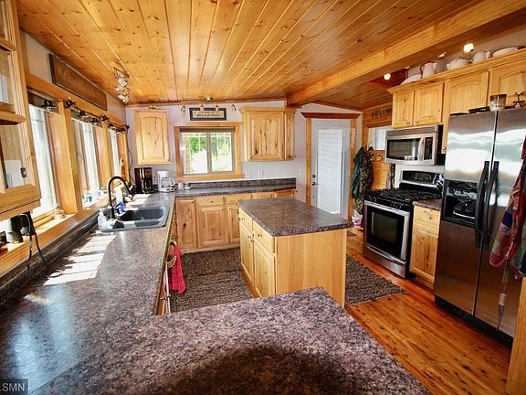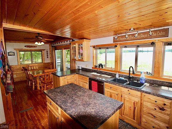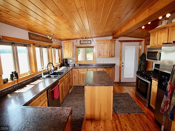 Check out the panoramic views of 236' of sand/gravel lake bottom on beautiful Camp Lake. Inside features a custom kitchen, hickory cabinets, stainless appliances, hardwood floors, large living room with wood stove, main floor den/office off the living room, custom bath with a tile shower and bath and laundry room. Outside features a large 24x34 heated and insulated garage with a lower level storage room and a large 3rd bedroom. This property also has a RV parking pad, new metal roof in 2015, newer dock and nice lake side deck.