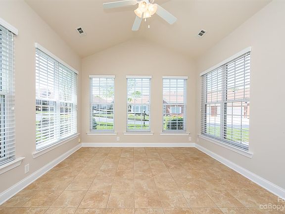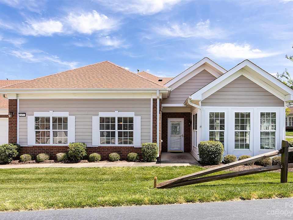 w/ high vaulted ceilings make this 2 bedroom, 2 bath townhome feel extra spacious. The walls of windows in the sunroom let loads of natural light in, while the great room w/ gas log fireplace flows seamlessly into the dining room, creating great open space for entertaining. A cook's kitchen features granite countertops, a tile backsplash, under cabinet lighting, recessed lights, 42" maple cabinets, a prep island, an 80/20 stainless steel sink & a pantry! An office w/ a ceiling fan & French doors can serve as a great work-from-home space or as a den or hobby room. The private primary suite has a deep tray ceiling, dual vanities & a large walk-in closet. A large secondary bedroom is across the hall from the second bath w/tile flooring & tile surrounding the tub/shower! This home offers one story living, a 2 car garage, lawn maintenance included, plus a great community clubhouse & pool!
