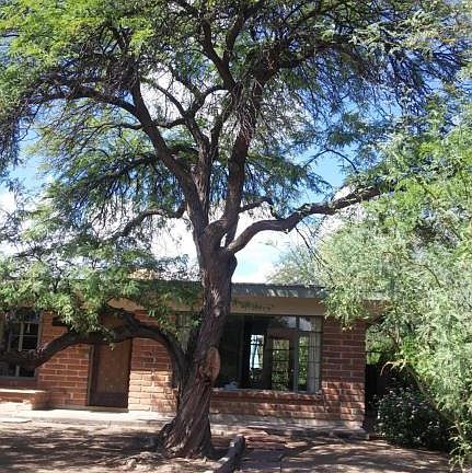 A Classic Design: 1953 Solid Adobe Block Construction with wide, shady eaves all around, gorgeous original stained concrete floors & wood doors, wonderful views of mature Mesquites from the open living room/dining room, flooded with natural light & has delightful corner windows in 2 of the 3 Bedrooms. Good sized closets & Kitchen, A/C, generous storage with hallway Pantry and Linen Closet, handicap grab bars in Bath with huge shower (old tub has already been removed if you decide to upgrade!) EXCELLENT LOCATION one block N. of Grant and one block W. of Mountain Bikepath to University. Wall of flowering Oleanders, mature Vines, & low care yard front & back with nice patio area on west side. Hard to beat for pure charm and character! Priced right for fast ''AS-IS'' Sale.