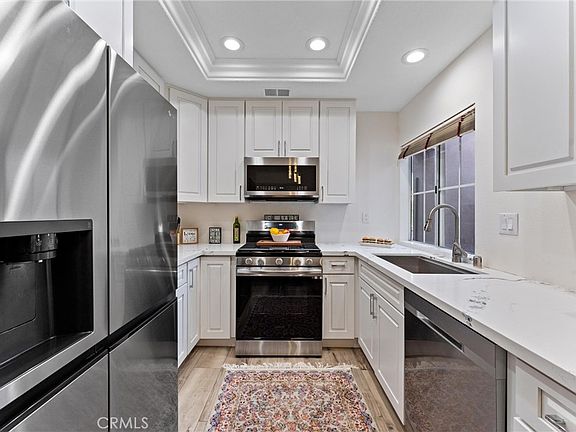 Beautifully remodeled 2 bedroom, 2 bathroom home with an open floorplan and plenty of light. Upon entry you will be entranced by the stacked stone fireplace with glass fire rocks. New wide plank laminate flooring throughout this modern charming home. The kitchen has been remodeled with Quartz counters, new white, soft close Shaker cabinets, stainless steel appliances and recessed lights. Large primary suite has views of the Laguna Niguel Regional Lake and dual closets. Primary bathroom has been tastefully upgraded with a gorgeous Quartz walk-in shower and Quartz vanity. Secondary bedroom with mirrored closet doors. The secondary bathroom has been updated with a Quartz vanity and new cabinetry. Detached garage and purchase pass for an additional space. Desirable Costa Brava community of Rancho Niguel offers pool/spa, play area for kids and is perfectly located for commuter or outdoor enthusiast. The lake and many nearby trails for walking, biking and many hiking areas too. Located near shopping, dining and entertainment areas and are a short distance to the beach. Optional membership in Rancho Niguel Recreation Club. Amenities include racquetball, pickleball, basketball, volleyball, tennis courts, playground, soccer field, gym and exercise room.