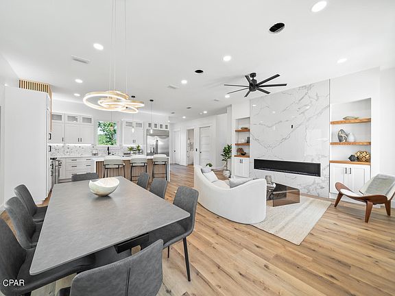 Step into the pivoting front wood door into a modern, open concept. The living room features a stone linear fireplace surround and built-ins. The dining room stands out with a chandelier and flows perfectly to the kitchen that offers custom wood accents on the island wrapped in waterfall Quartz countertops. GE Café appliances are flanked with white cabinetry and the range hood is custom accented to coordinate with the island. A large pantry and laundry is adjacent to the powder bath and next to the elevator, making it easy to access all floors.