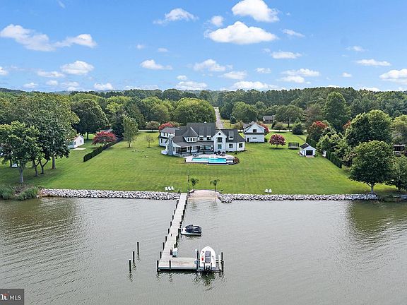 Experience luxury waterfront living at its finest at this stunning 2.7-acre estate on Greenwood Creek. Meticulously constructed on a double lot with over 300’ of shoreline, a private sandy beach, infinity-edge saltwater heated pool with water features & tanning ledge, and protected views across preserved land, this property is a rare find. Custom-built and completed in 2024, this home offers 10’ ceilings throughout, soaring to 21’ in the great room, 8” English oak floors, and walls of Anderson windows that showcase panoramic water views. The chef’s kitchen features dual islands, a Wolf 6-burner range with grill and griddle, stunning quartz countertops, Sub-Zero fridge, and a large butler’s pantry with prep sink and full-size fridge. The main level includes a luxurious waterside primary suite with spa bath and walk-in closet with island. Upstairs are 3 large ensuite bedrooms with custom finished closets, a private office, 26 ' x 55' bonus room, and multiple storage areas. The bonus room is very large, has closets and shares a bath jack and Jill style with the 3rd bedroom. Exterior highlights include new 120’ pier with 12K lb lift, floating jet ski dock, electric, water, and fish cleaning station. 6-car garage parking including detached garage with roughed-in guest house above. Mechanical features include 4 zone HVAC, 3 air handlers, 4 heat pumps and tankless water heater. There is propane for heat backup, water, pool and cooking and reverse osmosis system in Kitchen. The lower level is unfinished with 3200 SF with 9' ceilings and impressive fully sealed block system and plumbed for wet bar and full bath. An excellent location for boaters with a 10 minute ride from your dock to either St. Michaels or the Narrows. A special property with the most gorgeous sunsets imaginable. Golf, clubhouse and restaurant memberships available at nearby Prospect Bay.