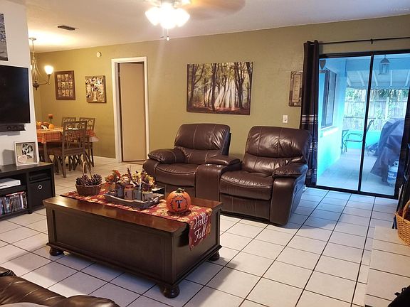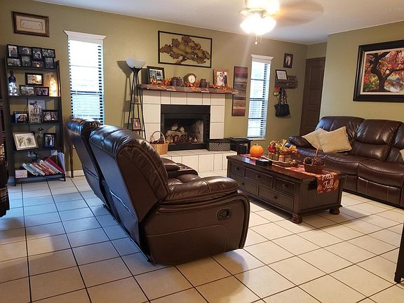 The open concept living space features a wood burning fireplace and direct view view to the screened wrap around porch. Kitchen has an oversized Breakfast bar adjacent to the Dining room for serving or additional entertaining space. Deep garage with plenty of storage space. Tile throughout and a split floor plan make this home a perfect fit for family and pets No HOA, and a brand new roof was just put on!