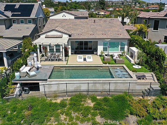 Gorgeous modern Mediterranean home with panoramic views. From the backyard on a clear day you can enjoy unobstructed views of the Palos Verdes Peninsula and Catalina Island. Located in a gated community named Marywood Hills and constructed in 2018-2019 by The New Home Company, this 4-bedroom/4.5-bathroom single family home exudes contemporary style and function. Offering 3,581 SF (per assessor), the living area contains tall ceilings, an open floor plan, and a design perfect for entertaining. The interior and exterior flow seamlessly, allowing residents and guests to enjoy the exceptional views from inside and outside the dwelling. Upon entering you will be greeted by an immediate sense of expansive space, but will continue to be impressed with the allocation of rooms as you move through the living room, dining area, and open kitchen. Downstairs you will find three bedrooms, all suites, including the primary suite, as well as a powder room for guests. Upstairs you will find a large room perfect for an entertainment space, play room, or large office, along with another suite that can be used as an upstairs primary bedroom. At the entry level there is a large laundry room with lots of storage and counter space, along with direct access to the attached 2-car garage. There is an additional 1-car garage that can be used for storage, a gym, or another vehicle. The current owners have installed a Tesla charger in the 2-car garage. They have carefully and thoughtfully updated the home to meet the highest expectations of today’s homeowner. Some of these upgrades and improvements include: smart home technology for lighting, security system, and audio system, as well as completely reimagined outdoor living with Mediterranean inspired vegetation, hardscaping, and citrus trees in the front and backyards. The owners also built a beautiful inground pool and spa, allowing bathers to enjoy time in the water while watching amazing sunsets from the southwest-facing backyard. The next owner will love the outdoor kitchen, built-in BBQ, shaded pergola, and the gorgeous outdoor fireplace. On the interior you will enjoy the surround sound speaker system throughout the home, custom California Closets upgrades in the downstairs bedrooms, and beautiful cabinetry, flooring, and countertops, not to mention unique and eye-catching light fixtures.