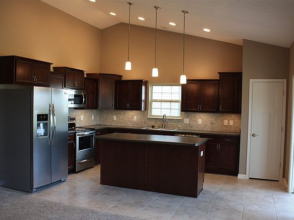 Sable model with Sun Room in Prairie Farms on Kokomo's east side. Built by Majestic Homes this ranch style home offers a great floor plan with 1645 sq.ft. , cathedral ceilings in great room with gas fireplace and 3 bedrooms, 2 full baths. Large open kitchen with flush bar top island and all new stainless steel appliances. Master suite with large walk in closet, double raised vanities and cathedral ceiling, and tiled walk in shower. 2 car attached garage with sodded front yard with irrigation system.
