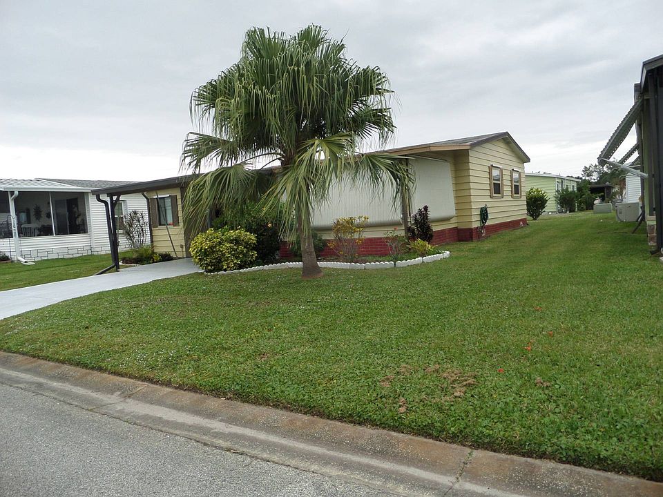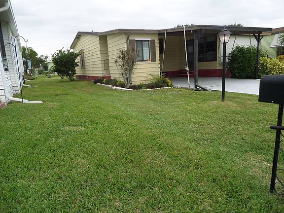 Cozy and cute 2 bedroom 2 full baths. Master bedroom has a large walk-in closet. All appliances stay including the Washer and Dryer. Park under the carport for easy access to the interior. Enter into the laundry room then into the eat in kitchen. Big living room with sliders to the very large sun room. Bedrooms are split and each have their own bath. Enjoy Low Lot Rent with a pool, clubhouse and very friendly neighbors. This is a 55+ community with LOW lot rent