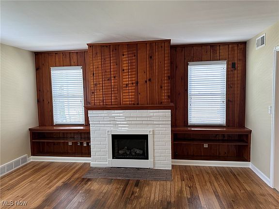 - Features: Built-in Features, Fireplace, Natural Woodwork, Window Treatments