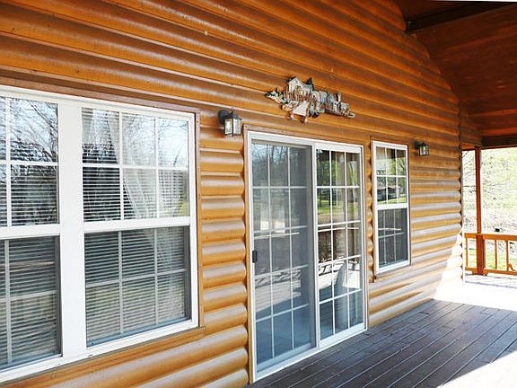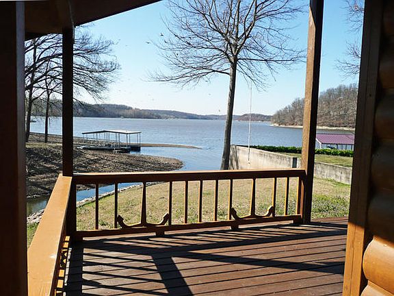 CRAZY LAKEFRONT VIEWS! Beautiful '07 LOG CABIN! See bridge to nowhere, pelicans, fireworks & crappie catchin' hole. Gentle slope, community park & boat launch. HUGE covered vaulted lakefront deck. Carved anchors on deck railings. Spotless, move-in ready! Open concept, vaulted ceiling inside, stainless, 2 bdrm, 2bth, 1,092 sq ft, propane owned tank, 2 dble carports, 2 storage bldgs. ONLY $130,000