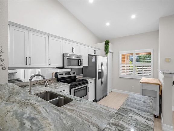 After a total renovation with fabulous upgrades and no expense spared throughout, this end unit is the only one you need to see. Discover resort-style living at its finest in this stunning, updated 3-bedroom, 2-bathroom end unit condo at 2453 Millcreek Ln, #201, Naples, FL. This second-floor residence in the desirable, gated community of Huntington Lakes features a sought-after open-concept floor plan with high vaulted ceilings, modern white shaker kitchen cabinets, granite countertops, and stainless steel appliances. Enjoy tranquil, panoramic lake views from the private, screened-in lanai, which comes equipped with electric storm shutters for seamless indoor/outdoor living. Residents have access to an impressive array of amenities, including multiple pools, a fitness center, tennis courts, and a vibrant social calendar, all minutes away from North Naples' premier shopping, dining, and beautiful Gulf beaches.